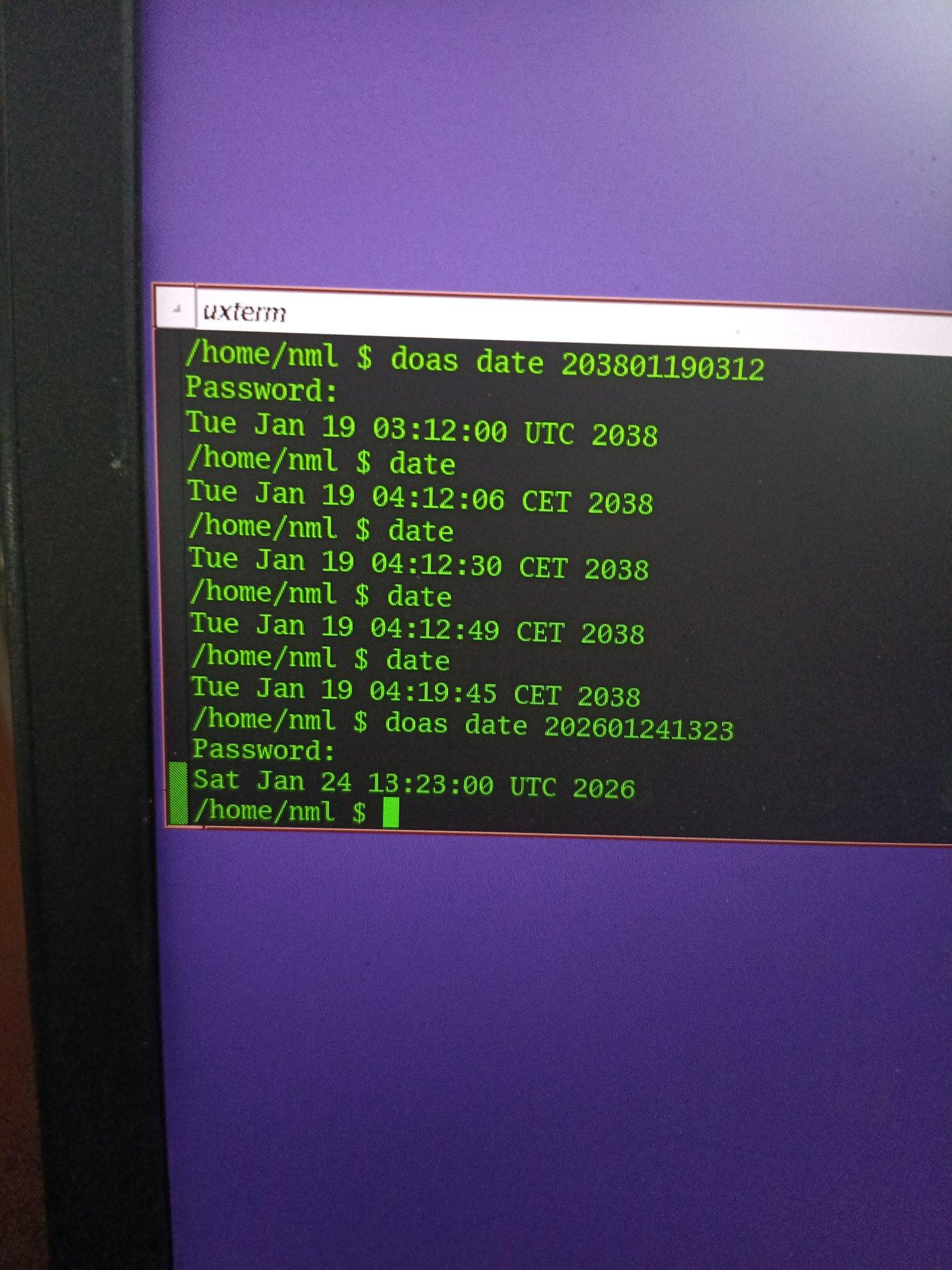 Provoked by a toot from @jamesoff I made the experiments with the #y2k38 time boundary on #OpenBSD (bigger screendump) and #NetBSD as illustrated.